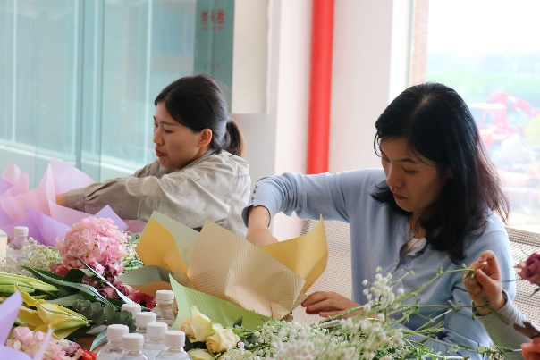 在由玫瑰花、洋桔梗、繡球花、百合、滿天星之香氣調(diào)和而成的陣陣馨香中,花藝師向女職工們講解插花知識,介紹花材的名稱、養(yǎng)護方案、花材的處理和修剪方法,示范插花步驟,女職工們聚精會神地學(xué)習(xí)后認真設(shè)計自己的花籃,相互討論,時不時迸發(fā)出爽朗的笑聲,經(jīng)過精心設(shè)計,一個個形態(tài)飽滿、充滿生命力的花籃就誕生了,大家紛紛拿出手機,記錄下這美好的時刻。
